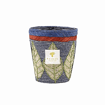 The Lamba raffia scented candle was hand crocheted by a women’s cooperative in Madagascar. The naive leaf patterns are embroidered with colored raffia threads on a natural background. At the top, the candle is finished with an embroidered chevron, giving the object a very elegant look.